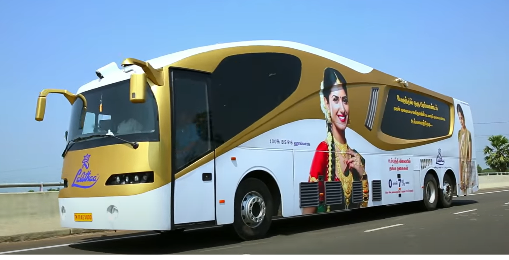 Lalithaa Jewellery seems to have introduced a mobile jewellery shop in the form of a modified long chassis bus. I think this is a darned good innovation. There used to be a time when the predominant way of doing jewellery was to go to a jewellers shop, where you discuss patterns, weight, wastage etc, and then the jeweller would custom make it for you.